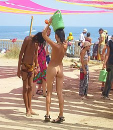 Young nudist friends naked together at the beach