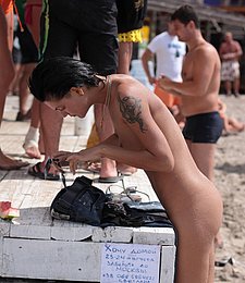 Sexy naked teens play together at a public beach